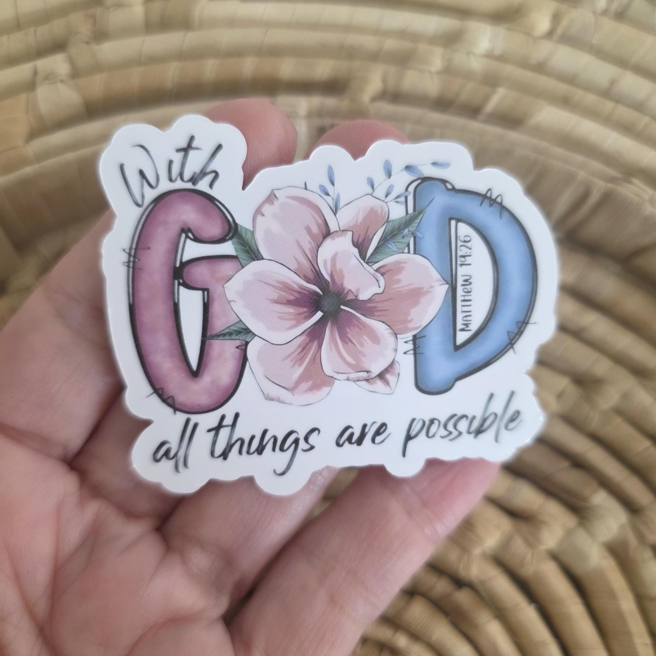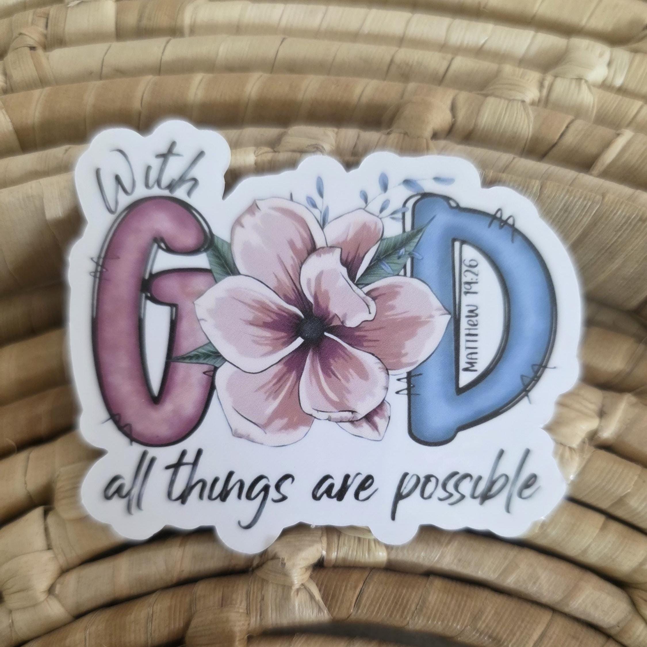With God all things are possible christian sticker. The sticker is made with orafol 1917 sticker paper making it perfect for water bottles, notebooks, laptops, bikes, and all sorts of other items. Make sure to clean and dry the surface thoroughly before applying. Handwash all items. Do not put in dishwasher.