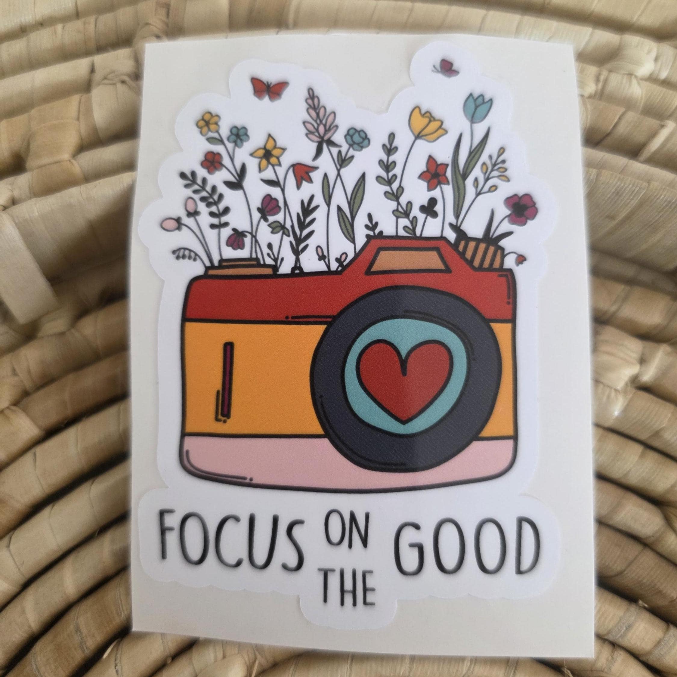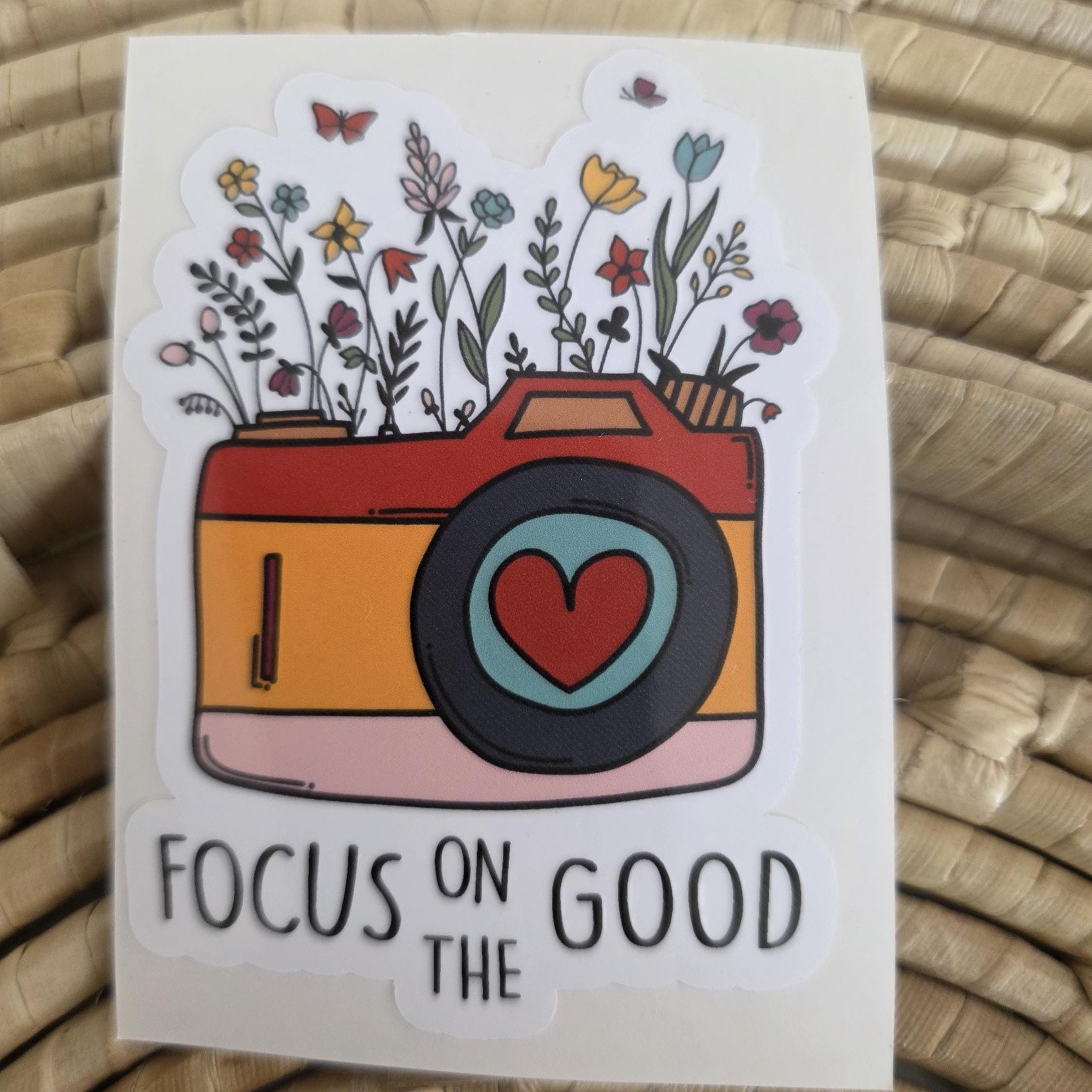 Focus on the good flower sticker. Place on water bottle, laptop, bike, journal, car or anywhere you want a bit of inspiration.